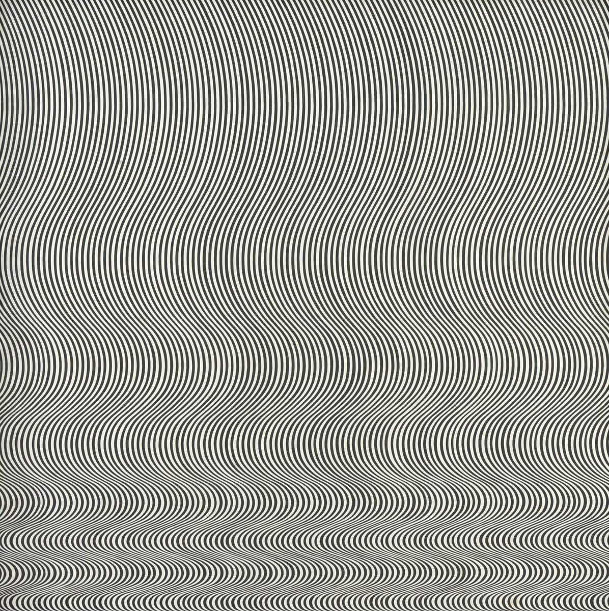If Bridget Riley were working today, would she have had a computer realize her ideas, even just the black-and-white ones? The result would be more time-efficient, certainly, and even more mathematically and executionally perfect. Weirdly, the digitized image shows the image as more handmade, more gray-scale, than it looked in reality—perhaps because it magnifies imperfections, or perhaps because pixels are cruder than the analog atoms of paint. Were the departures from perfection—which must be there, whether I was aware of them or not—intentional or simply unavoidable? If Riley were working now, would she have tried less hard to avoid them?
